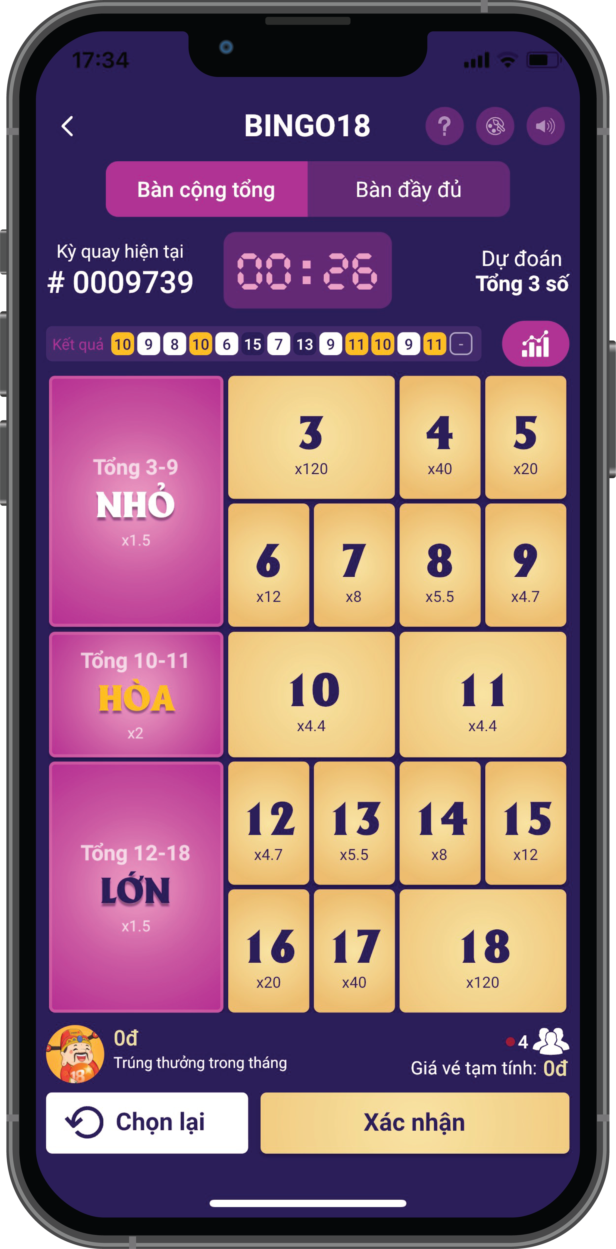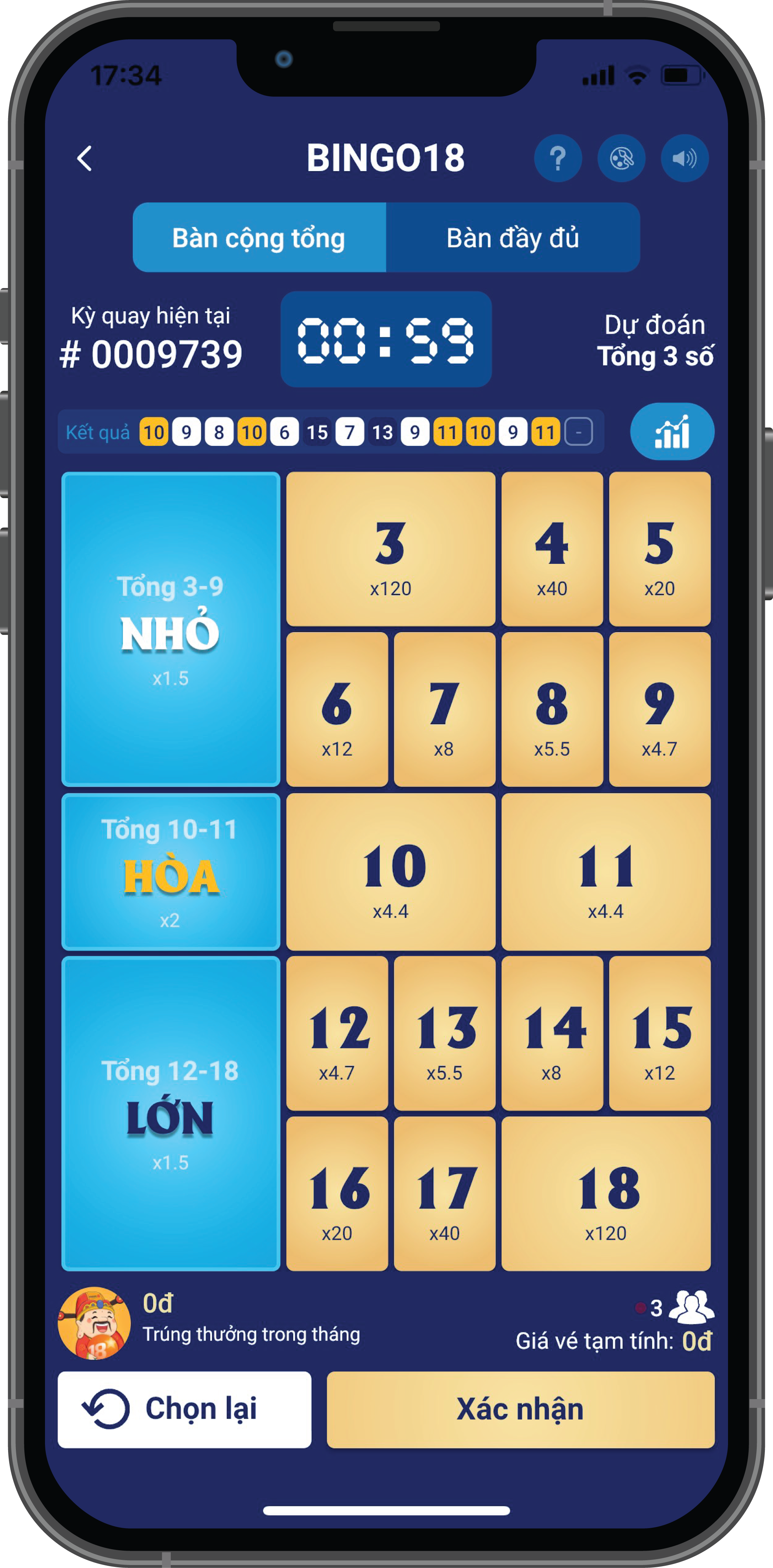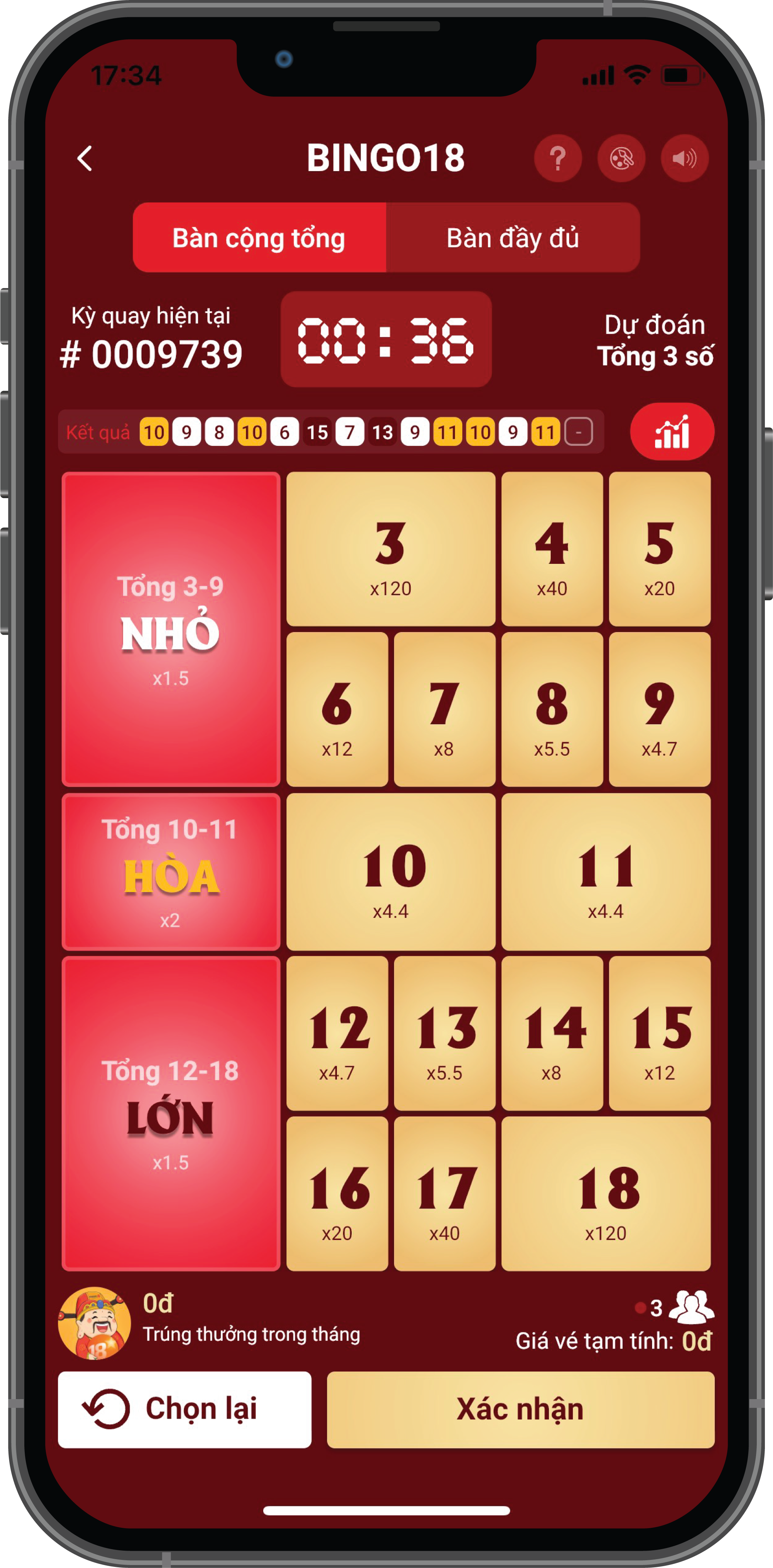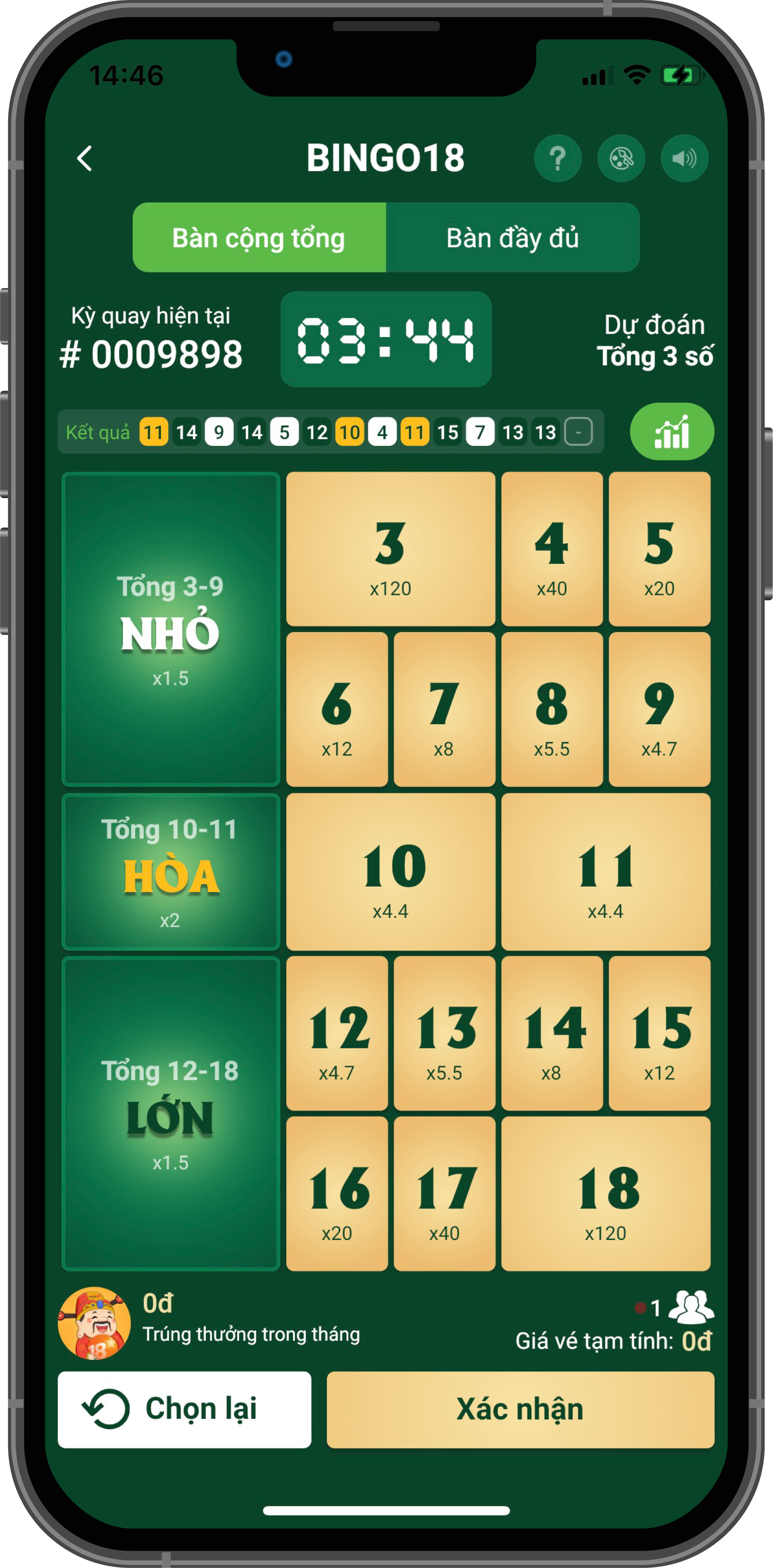 Dự đoán tổng 3 số kết quả từ 3 đến 18.