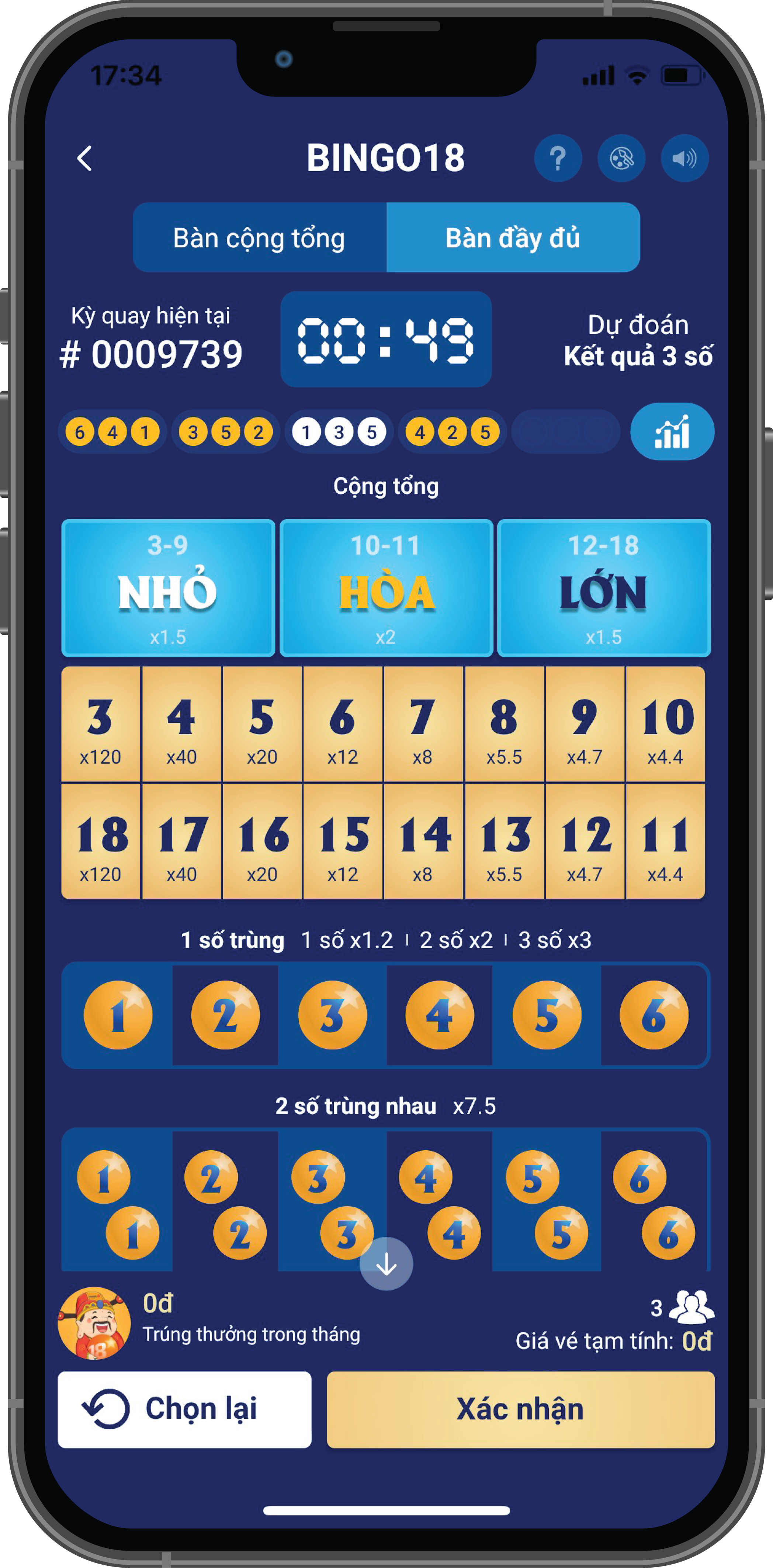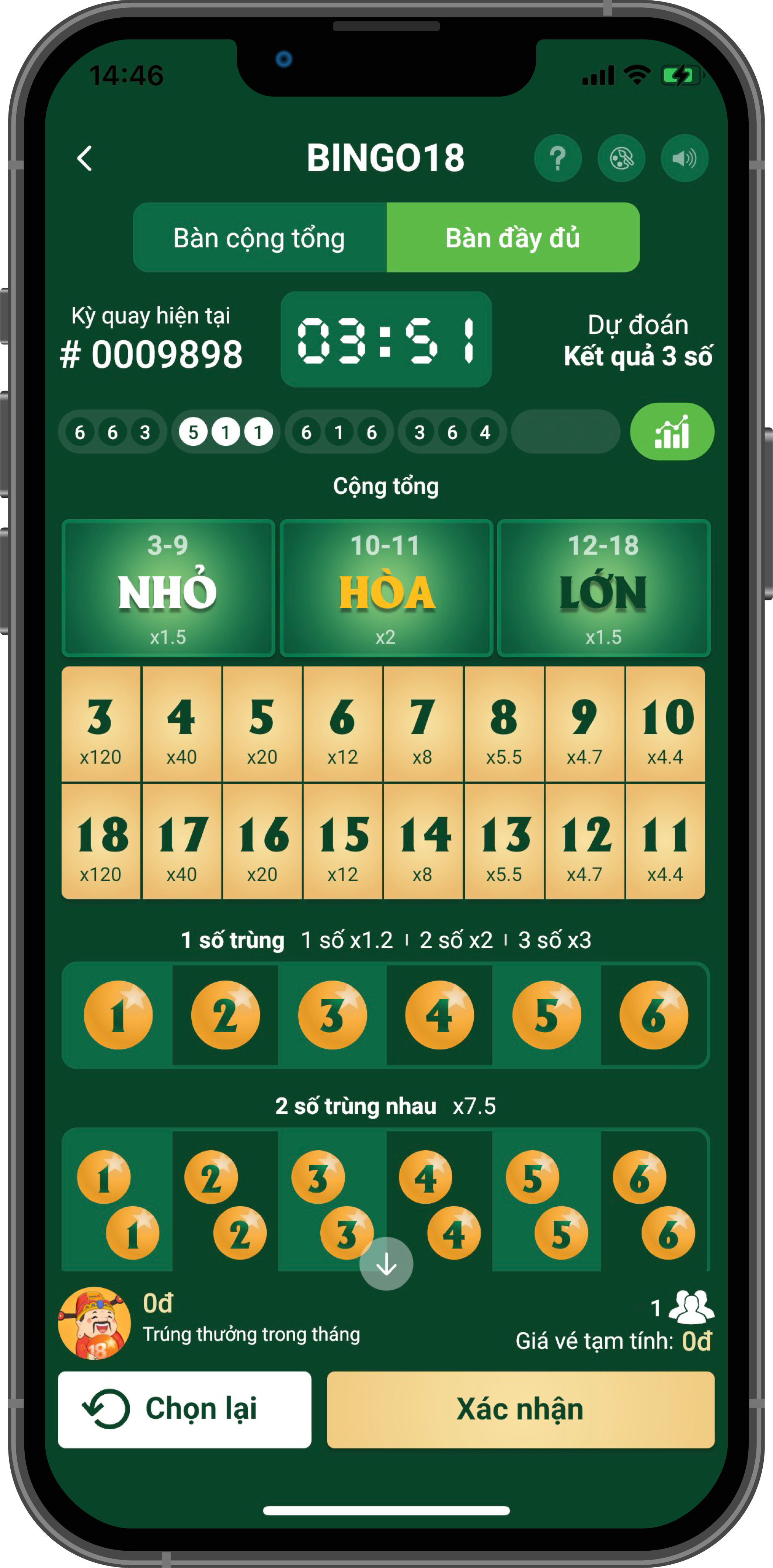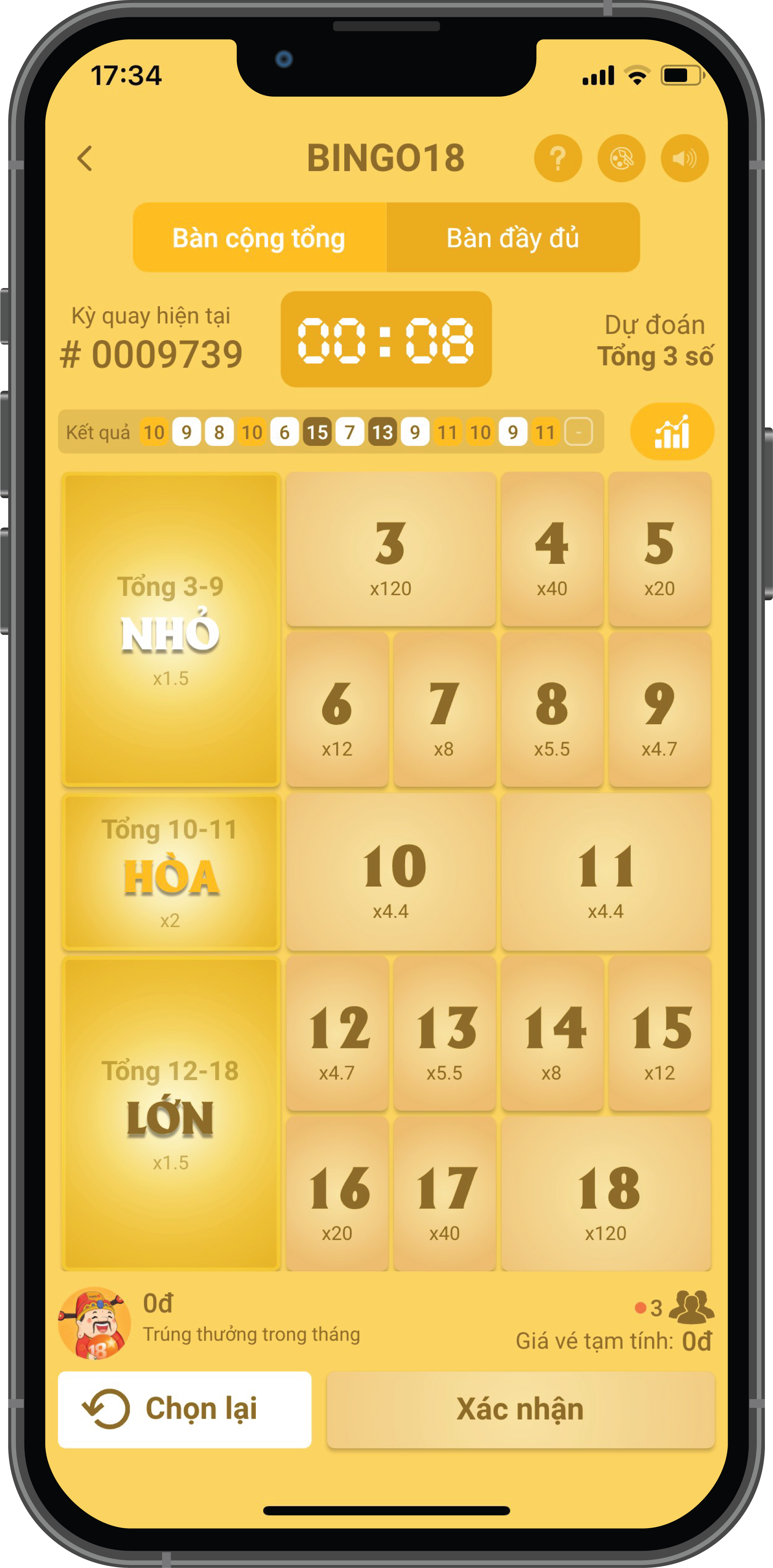 Dự đoán tổng 3 số kết quả từ 3 đến 18.